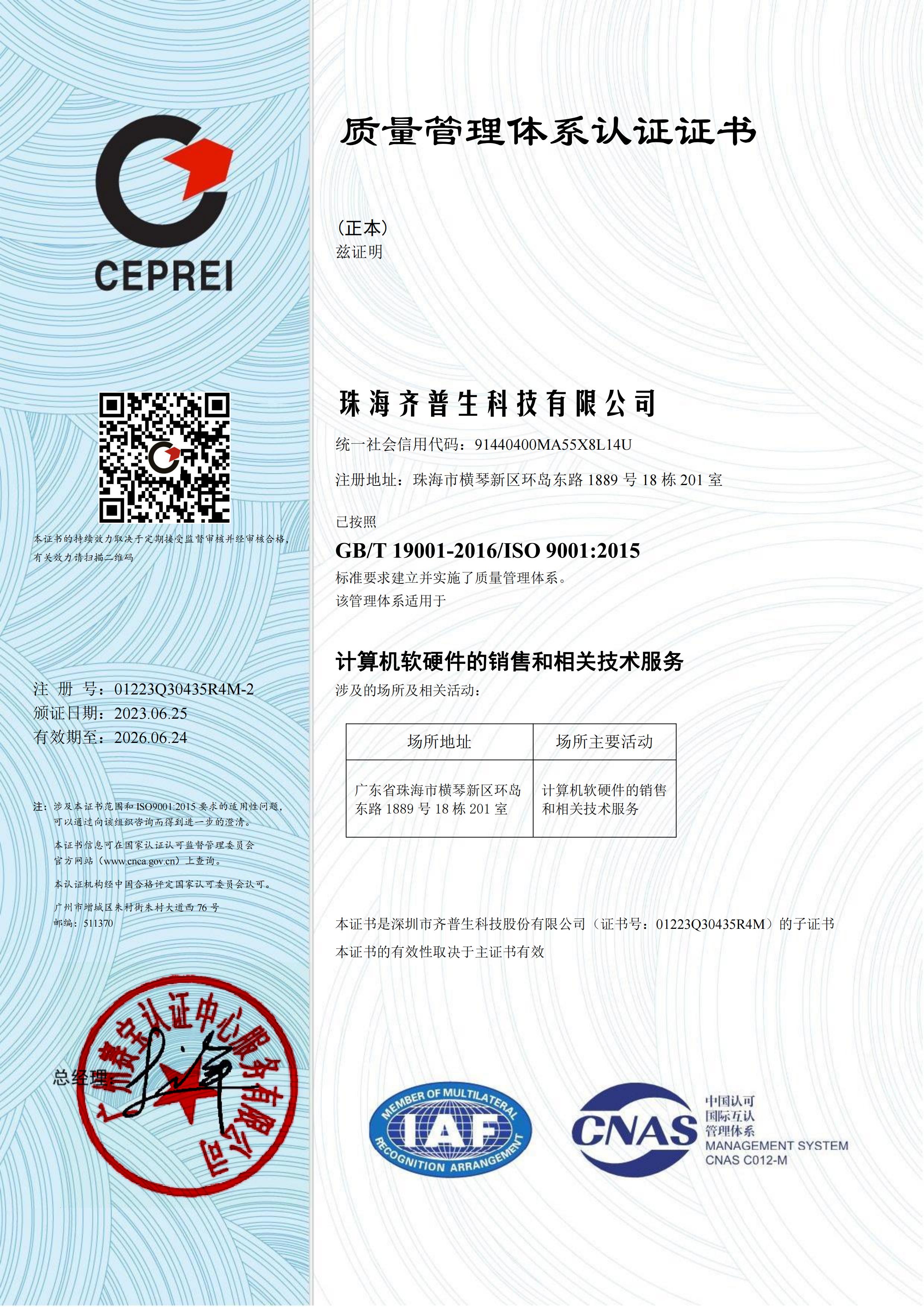 • ISO9001證書(珠海)
