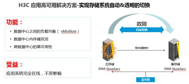 對于這一點,新華三推出了應用高可用解決方案。這一方案的重點就是實現存儲系統自動、透明的切換。通過數據中心之間的負載均衡、數據中心內存儲雙活、跨數據中心的高可用性等功能,讓金融應用系統可以忽略外部故障影響,完全在線。